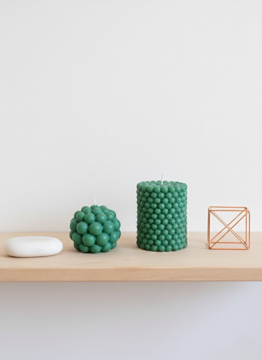 Een set van twee geometrische sojawas kaarsen in bubbelvorm. De intense, groene kleur en de verschillende hoogtes van 7 cm en 5 cm creëren een modern en vrolijk decoratief accent.