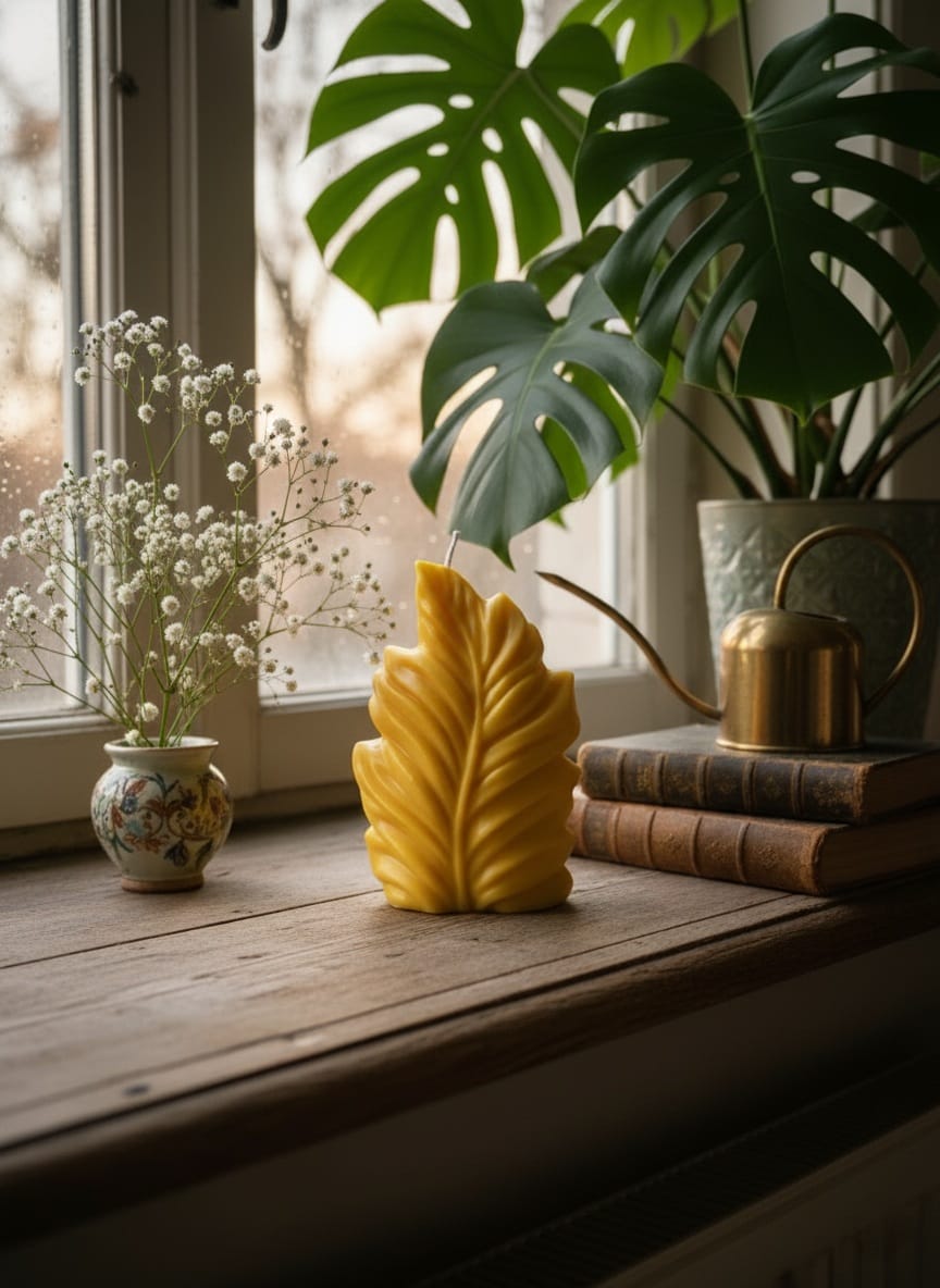 Een opvallende sojawas kaars in de vorm van een blad. De intens gele kleur en het delicate patroon creëren een vrolijke en warme decoratie met een hoogte van 13,5 cm.